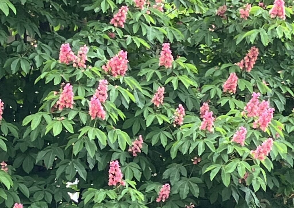 ベニバナトチノキ マロニエを交配して作出された園芸品種で、ソフトクリーム状の花序を出す。